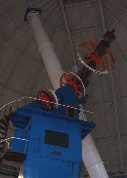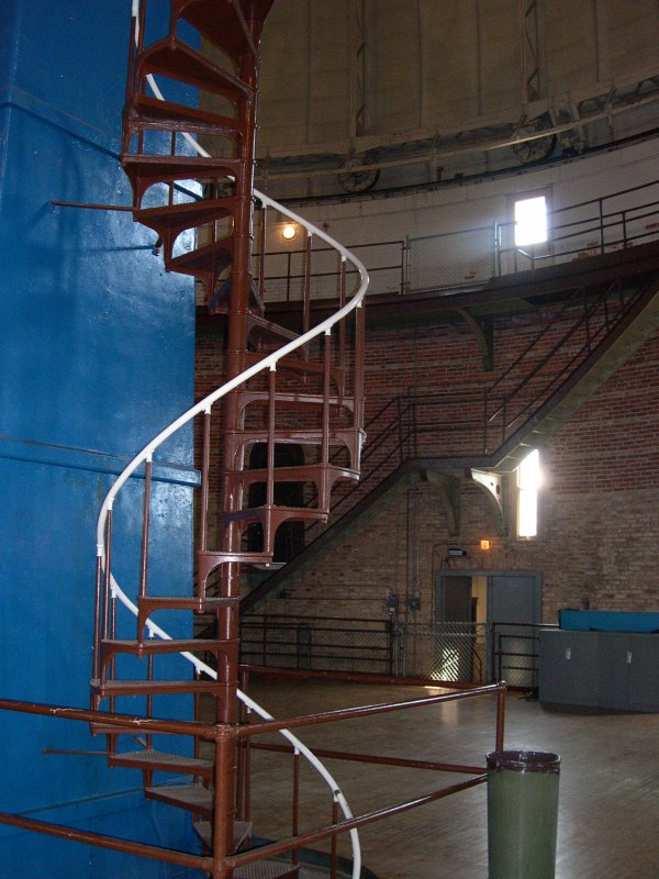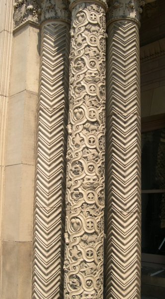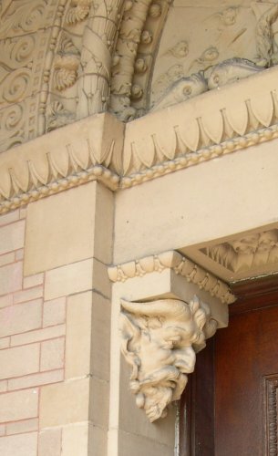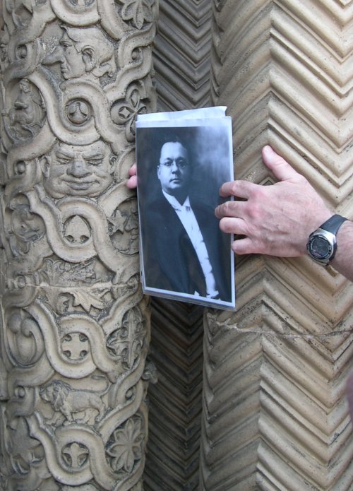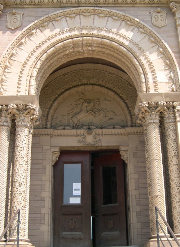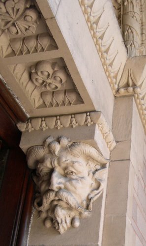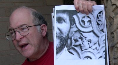 The Yerkes Observatory(owned by the University of Chicago, built 1895) Our guide (in red) suggested that one face on the column, which is adorned with signs of the Zodiac, isthat of U of C's first president, William Rainey Harper. If so, it is not a good likeness. Directlyabove that face is another, in profile, with a very long nose; the scar at the tip was created when a wasp wasremoved--as the guide's photo above shows, it originally sat on the nose; possibly this had to dowith some anecdote about building the observatory. But it offended somebody, so all the wasps have been removed.
