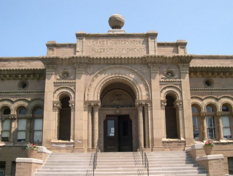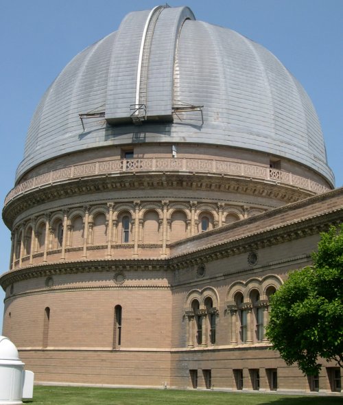Right ahead of George, on top of the trees on the horizon, is theYerkes Observatory.