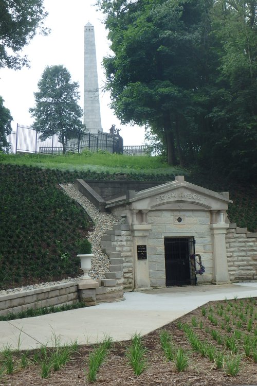 At Oak Ridge, where Lincoln is buried. Incredibly, the entire monument had to be taken down 30 years after it was completed and reconstructed. The first picture is the Receiving Vault where the President's body lay May through December 1865 (his son Willy with him). Funeral services for Lincoln were held here May 4, 1865. From the end of 1865 to 1871 the bodies (and a second son, Eddie) were in a temporary tomb. Tad, a third son, was the first to interred in the Monument 1871, followed by his father and two brothers.