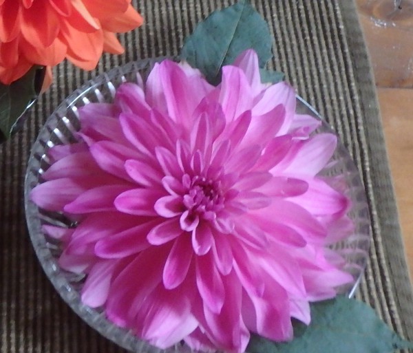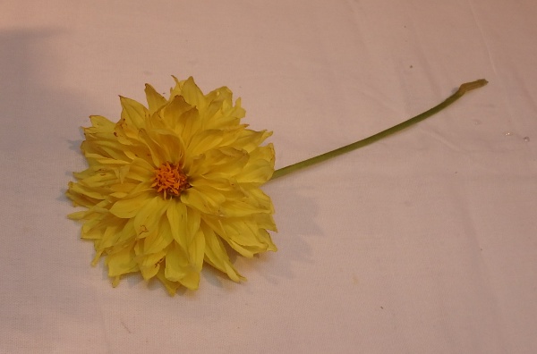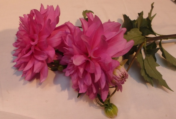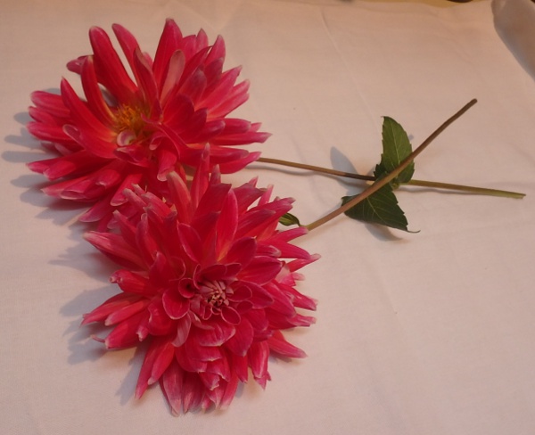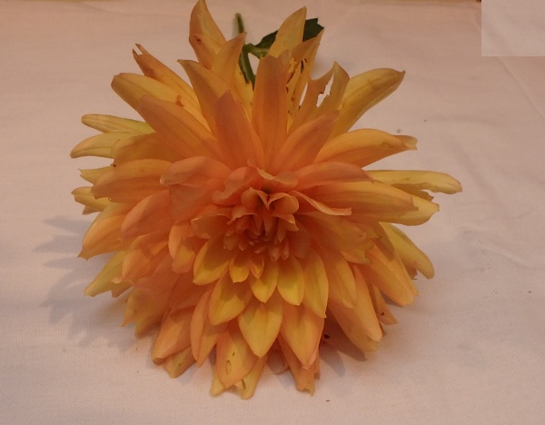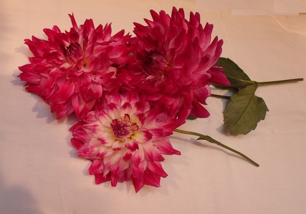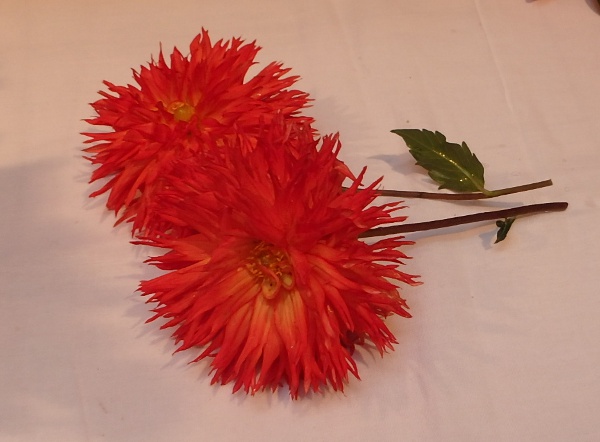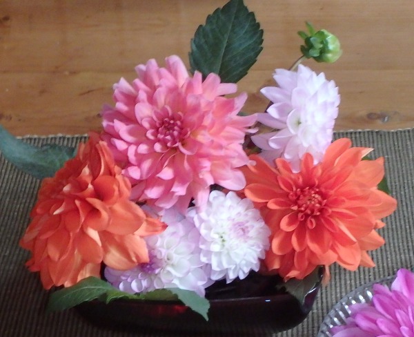 left to right: far left and right is "Olympic Flame," "Midnight Moon" 3 small blooms; top center "Excentric" (missing yellow accents)