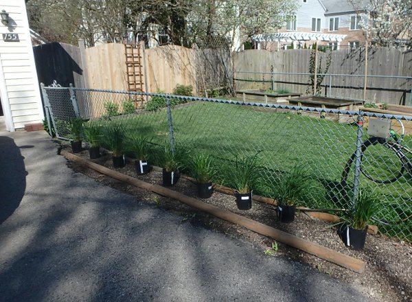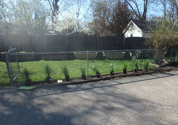 Setting out the new Karl Foerster grasses to measure the space All lined up, and a new trumpet vine from next door