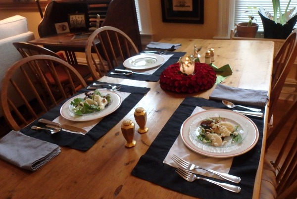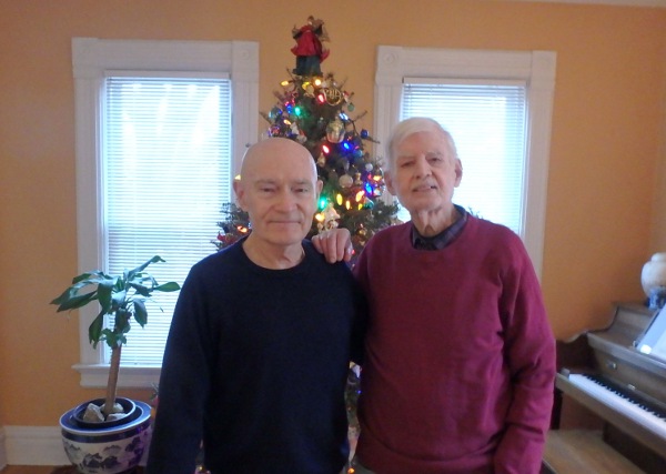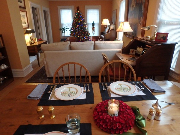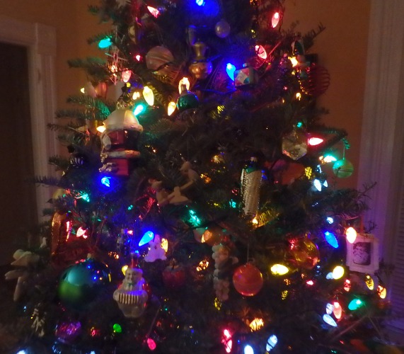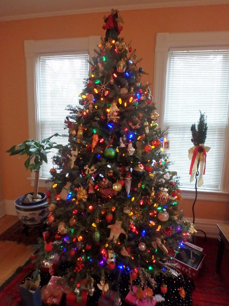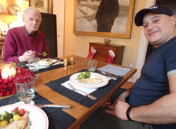 On 12/18: carrot soup with toast; pear and walnut salad with bacon and grilled chicken Christmas cookies from Myrna and Jo; Eric and the tree