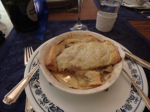 Puff pastry duck pot pie with shallots, green olives, and Gruyère