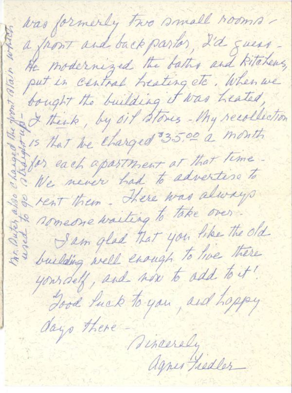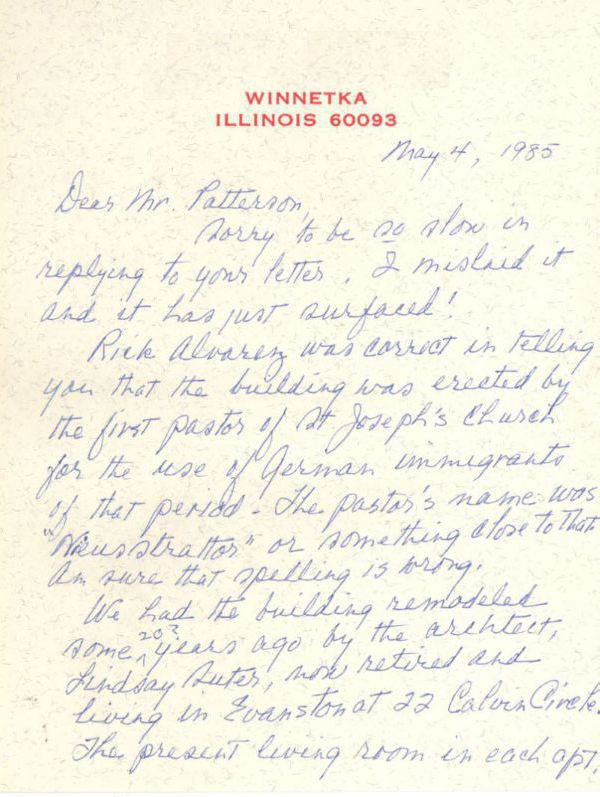 The 1885 date is necessarily approximate, given the spotty nature of surviving documents, but old tax records, village directories, and the style of the building (known to architectural historians as “Folk American”), combine to establish a clear window of origin from the 1870s to the 1890s. Currently the Cook County Assessor puts the age of the house at 122 (a construction date of 1893) but assessors records are not always reliable, and construction could have been as early as 1873, the date when the lot was platted. Village directories began to be published in 1890, and the one for 1898 shows the property to have been occupied in that year by an Andrew (or Andres) Roesner and his wife Helena (nee Knobel). These are the earliest residents we can identify by name. What was Wilmette like in the 1880s and 90s? George D. Bushell, in his Wilmette, a History (1976), refers to “a scattered settlement of houses surrounded by thick woods and huddled within a few blocks of the depot” that was on the verge of transformational growth. He notes that in 1887 there were only about 700 people living here. Many immigrants from Germany were beginning to settle in the area, however, and small workingmen’s cottages, carpenter-built and without adornments, were springing up to house them. One such was 155 Prairie. The first pastor of St. Joseph’s Catholic Church, Father William Netstraeter (himself an immigrant from Trier, Germany) was instrumental in developing much of this housing, and 155 Prairie may have been one of his projects. I first heard of the Netstraeter connection from Rick Alvarez, one of the rental tenants at the time I bought the property in 1982 (for $86,000), and this was later confirmed with seeming certainty by Mrs. Agnes Fiedler, the previous owner. Born in 1843, Father Netstraeter founded St. Joseph’s parish, and was pastor of the church between 1872 and 1923. He died in 1924. In addition to his pastoral role, he also served as a trustee of the Village Board from 1882 to 1887. (For her letter, go here.) Originally, we believe, the second floor of this house was the living area while the ground floor was a sort of tack room or above-ground basement. (There is no below-ground space.) But by 1982 both the first and second floors were in use as living units. In 1985, as I was planning improvements to the property, I asked Mrs. Fiedler what she knew of its history. In her reply she endorsed the Netstraeter story and said that she and her husband, Judge George Fiedler, had remodeled the building “some (20?) years ago,” enlarging the present living rooms by combining two smaller rooms on each level and installing updated gas heating systems. Previously, she believed, heating was by oil stoves. They also changed the layout of the front porch and stairs. The Fiedlers were Winnetka residents who held the Wilmette building as a rental property. I kept it as a rental property for a couple of years before Allen and I decided to make it our home. To do that, we needed to make some changes. Among its drawbacks, the house had no internal connection between its levels. Exposed stairways, front and rear, were the only access to the second floor and the attic. And having had absentee owners for so long, the building was by no means in attractive repair. I went before the Zoning Board of Appeals in April of 1985 with a plan to correct some of the obvious deficiencies, and I argued that as a live-in owner I would be able to provide attentive ongoing maintenance, thereby improving the housing stock of the village. By a one-vote margin (as I recall) I was granted a variance to build a two-story addition at the rear which would add one room to each level, enclose the exposed rear stairs and attic access, and provide for a below-stairs laundry area. Evanston architect Kent Marthaler designed and supervised the addition. The subsequent 30 years in which Allen and I have occupied the property have seen a gradual succession of improvements as funds permitted. The decaying front stairs were demolished and rebuilt. A dilapidated and doorless garage was replaced. Heavy wooden storm sash that had to be put up and taken down seasonally were replaced by aluminum triple-tracks, most of which have since given way to double-glazed replacement windows. Kitchens and baths have been updated. New oak flooring now covers the old painted pine planks. Furnaces have been replaced and central A/C added to the second floor. A screened porch overlooking the back garden was added within a few years of the 1985 addition. Landscape improvements have included a complete reconfiguration of the lawn areas, with new turf, groundcover, trees, shrubs, perennials, and walks. Had we not made this house our home and our project for the last three decades, it would almost certainly have been demolished years ago and replaced with something much less interesting (in our opinion) and likely out of character with the neighborhood. We extend grateful thanks to the Wilmette Historical Society and its board member Joe Hinkel for unearthing many of the historical details cited here. One of the factors complicating Joe’s job was that successive directories used varying street names to situate the same property across the years. What is now Prairie Ave. was at one time known as Gross Point Ave. south of Wilmette Ave., but was called Kline north of Wilmette Ave. Then for a time it was Kline both above and below Wilmette Ave. Finally it became Prairie. (Sorry, Mr. Kline. Whoever you were, your commemoration was short-lived.) We are pleased that we could breathe new life into one of Wilmette’s “Century Homes” and that its historic origins have been authenticated by the Historical Society (pictures just below). George Paterson, Sept. 1, 2015 |